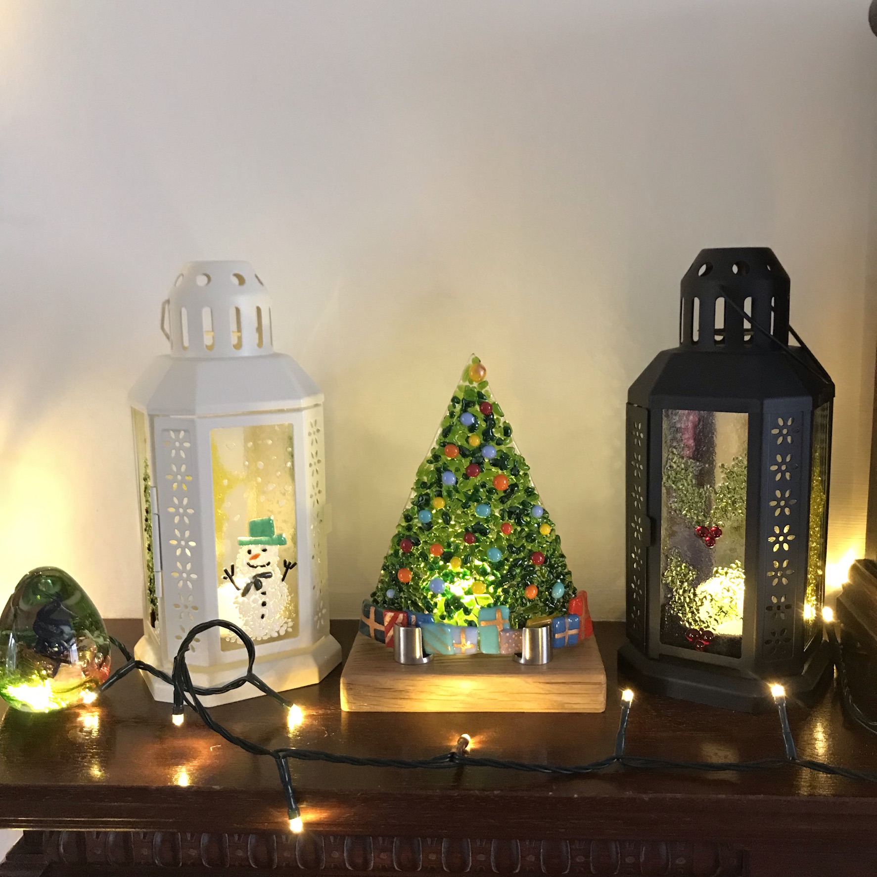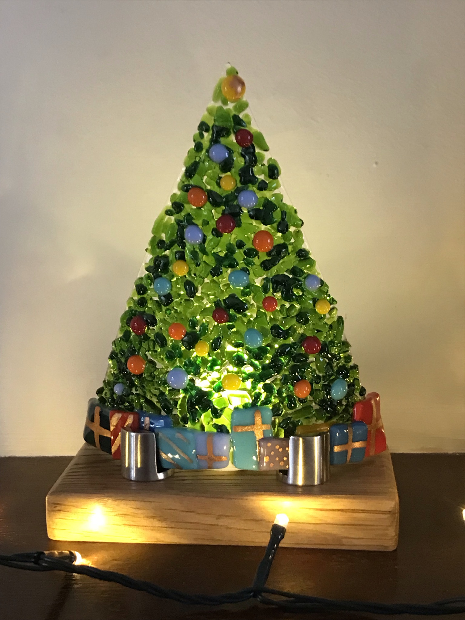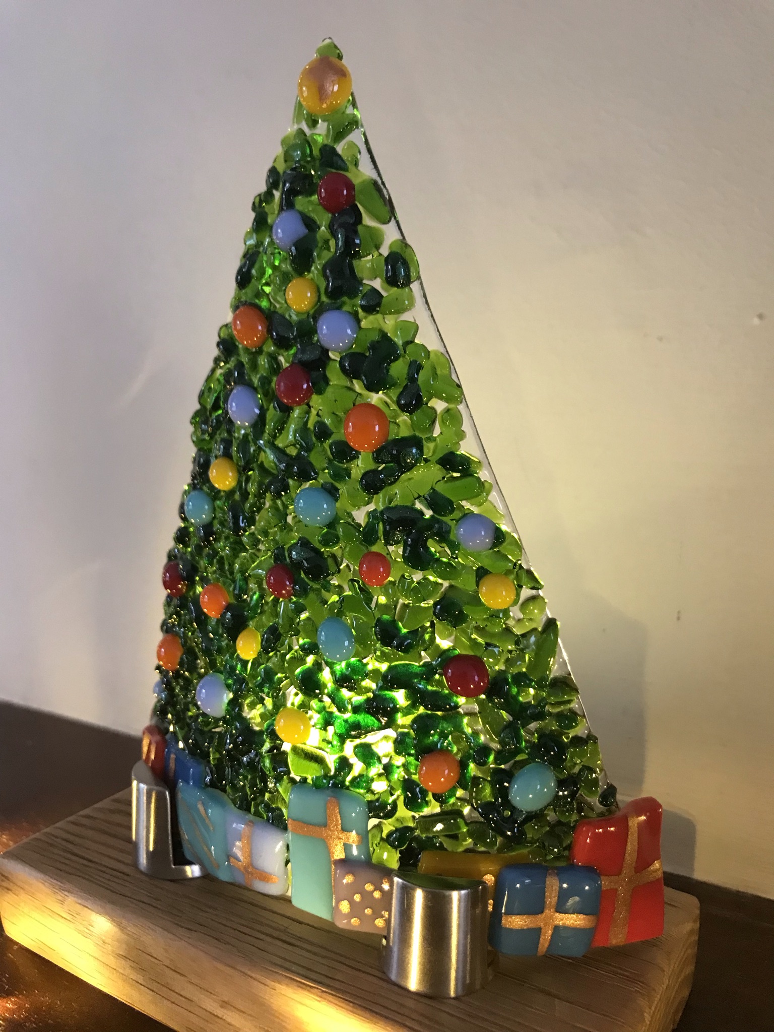 Back by popular demand, this Christmas Tree will make a stunning addition to your Christmas decor this year. Moss green and shimmery Aventurine green frit form it’s branches and decorated with opaque baubles and presents wrapped in gold ribbon. All mounted on a handcut and finished reclaimed antique oak stand with a battery tea light to make it glow.