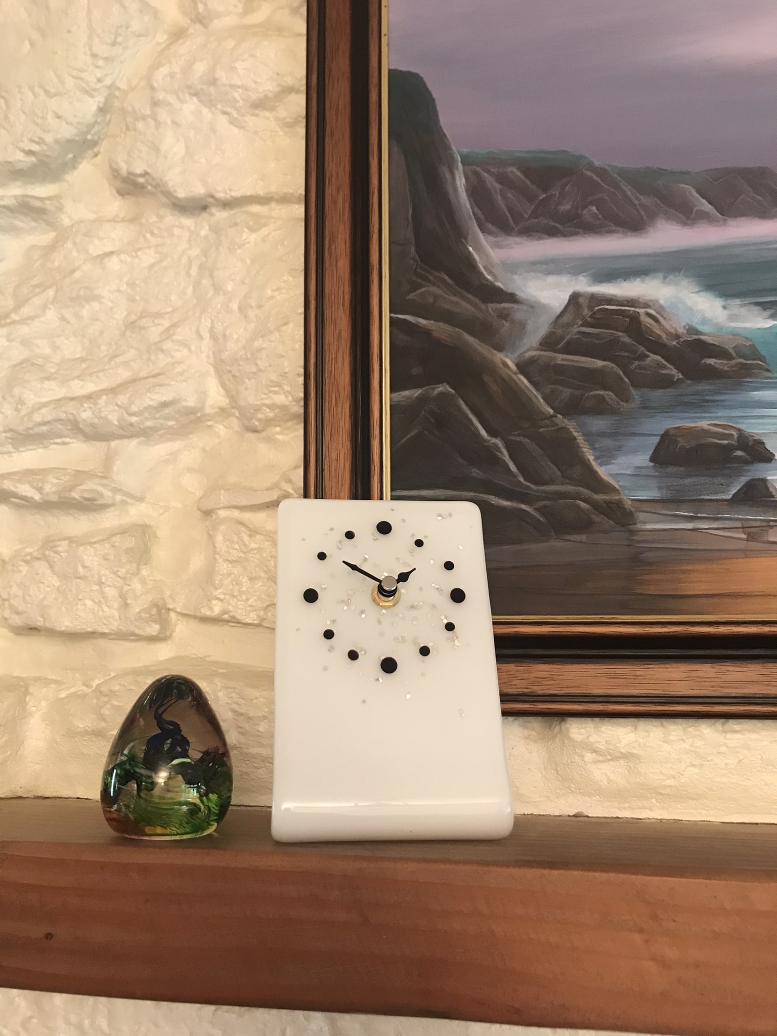 This elegant black and white clock features glossy black dots and silver mica for a classic and simple finish.