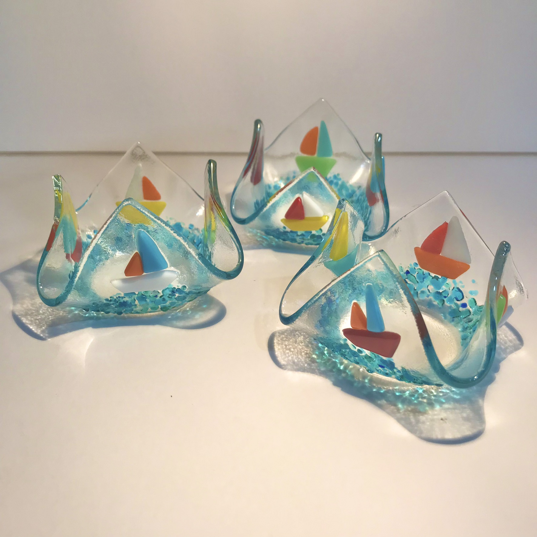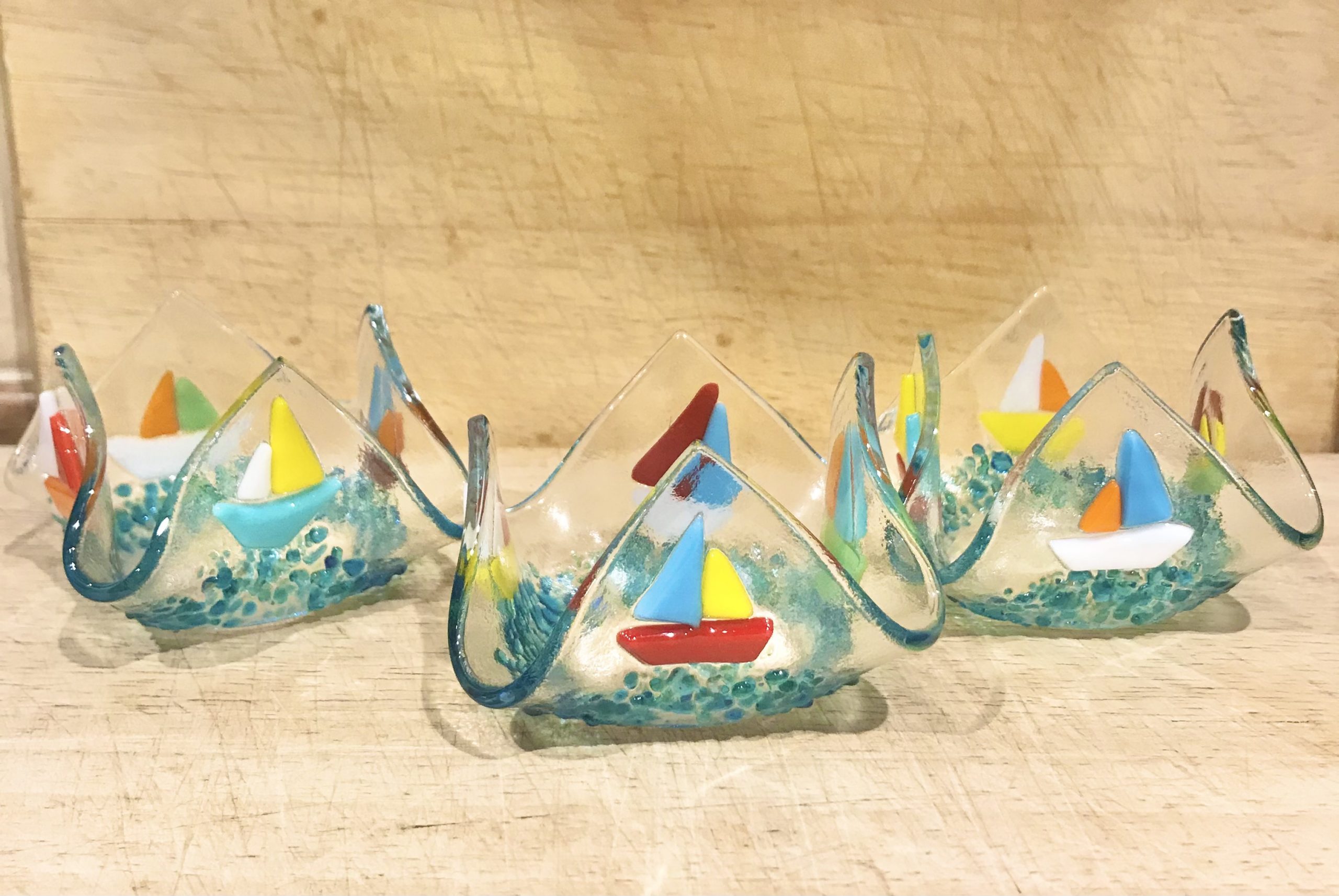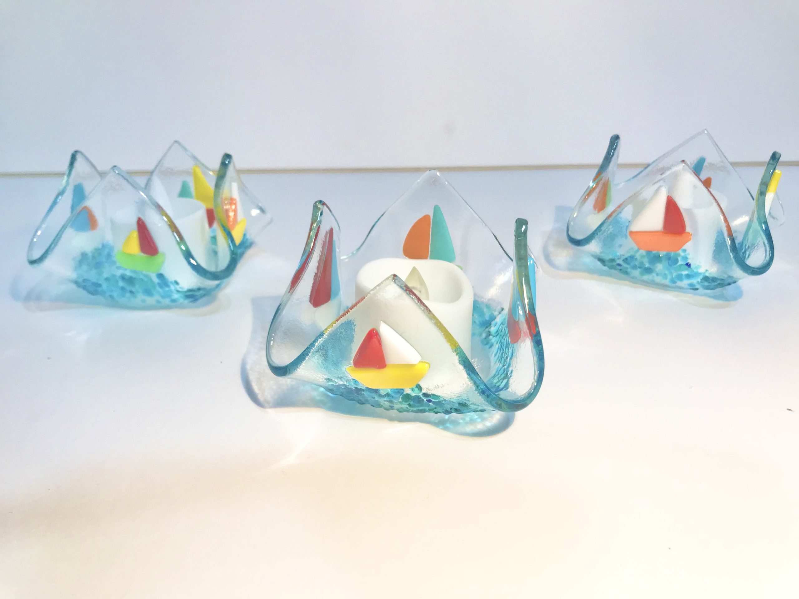Memories of summer and in honour of Mischief completing her RYA Level 1 these fun and beautiful candle holders feature four unique sailing boats, one in each corner, sailing on a topaz and aqua sea.