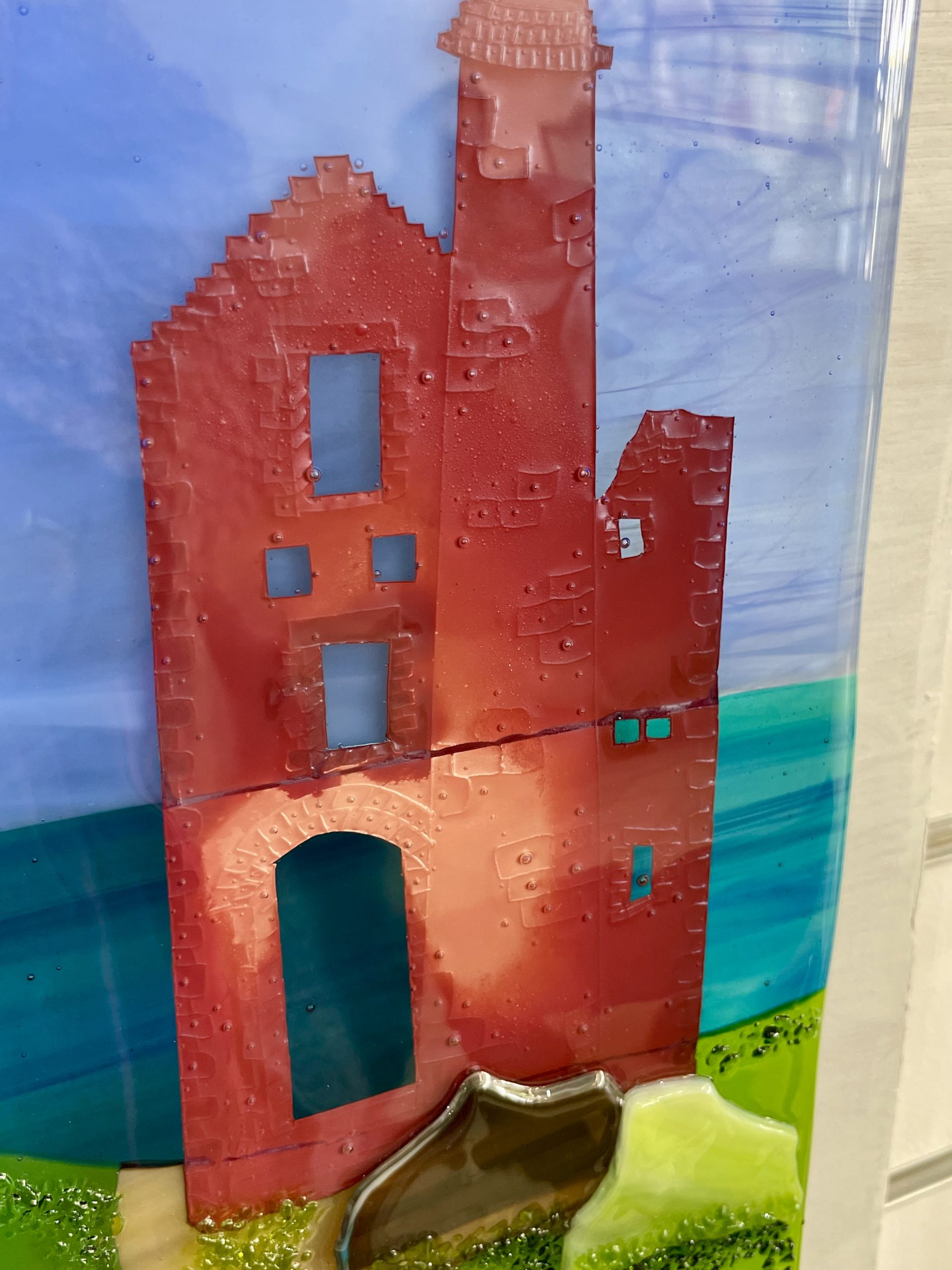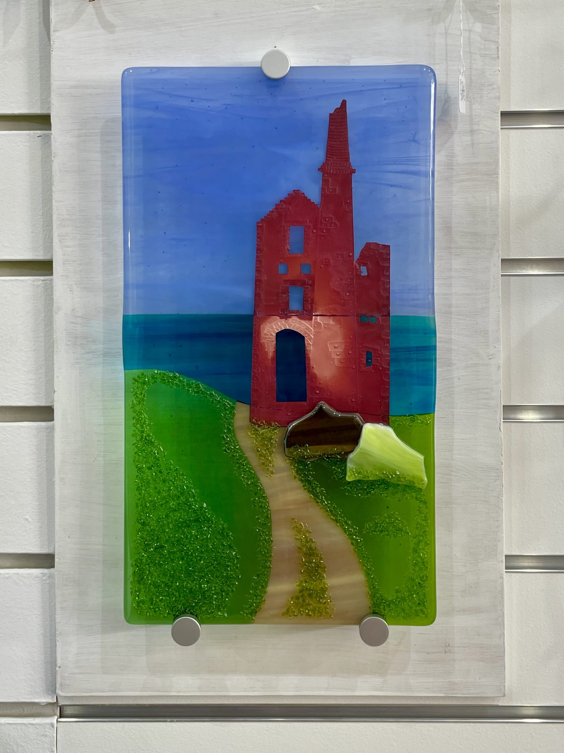 The engine house in this piece is hand cut from sheet copper and embossed with stonework details before being encapsulated between sheets of glass. The heat of the kiln turns is from shiny copper to a rich red with flashes of blue.
