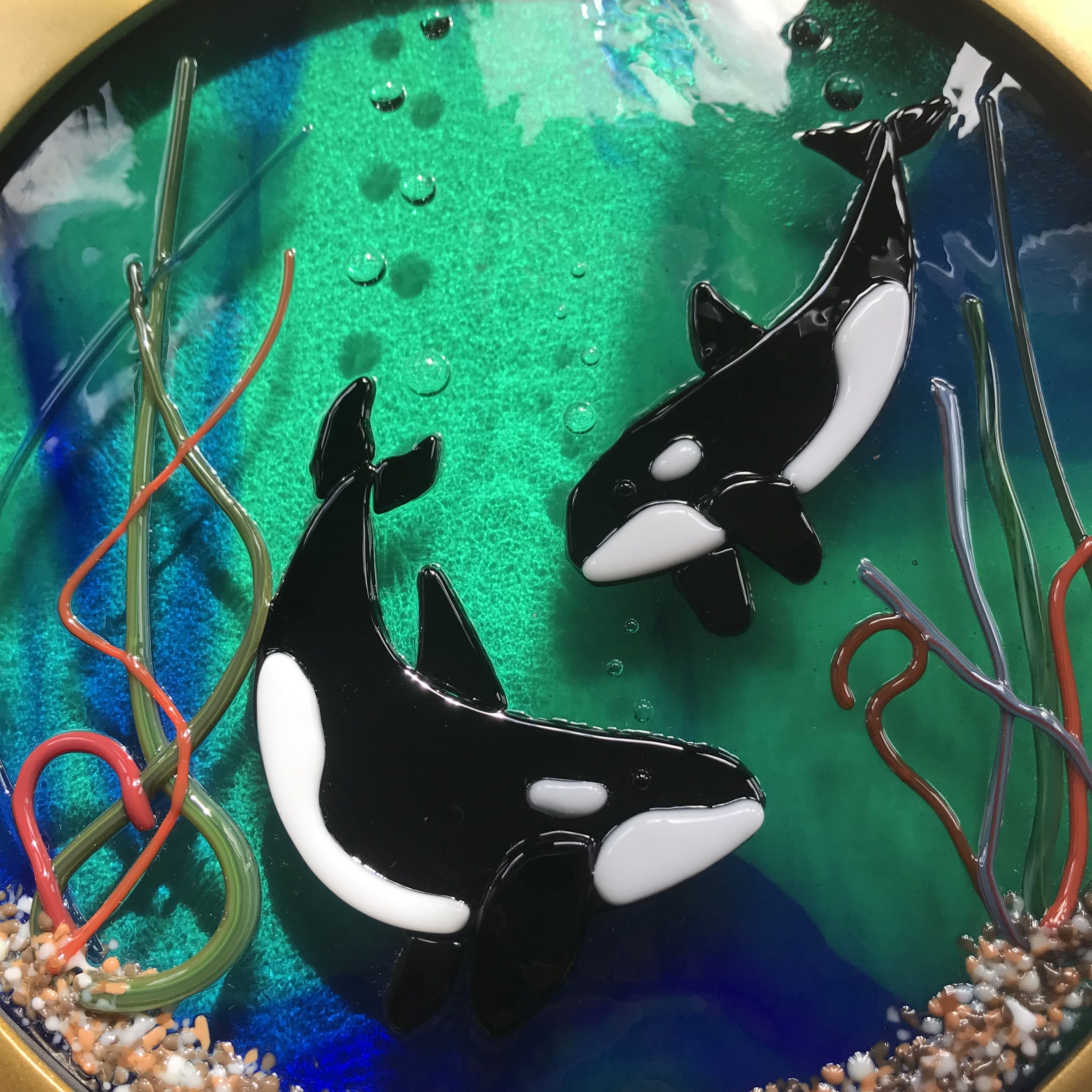 Each orca piece is cut by hand before being assembled. Delicate, wavy vitigraph make up the undulating seaweed while a custom blend of frit makes the seabed.