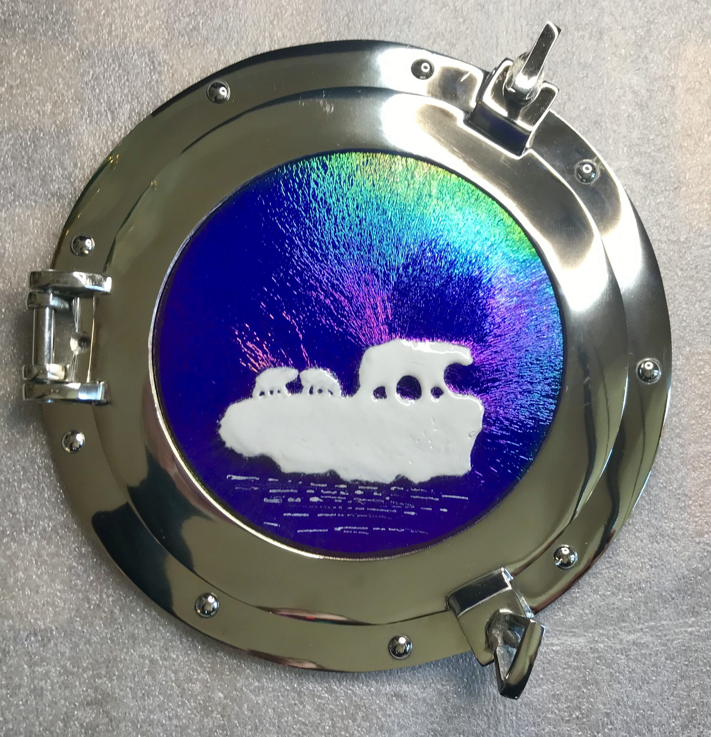 As the light changes through the day and you move past this piece the glass will change from deepest blue to reflecting the colours of the Northern Lights.